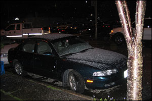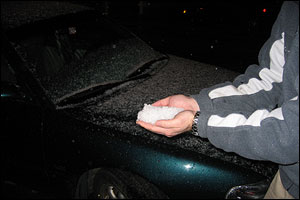 I'm not crazy. I swear. It is SNOWING in San Francisco. Okay, it's probably really little tiny hail, but it's close enough. Close enough, I say! It is icy, cold, and can be used to create small icy projectiles...need I say more?
